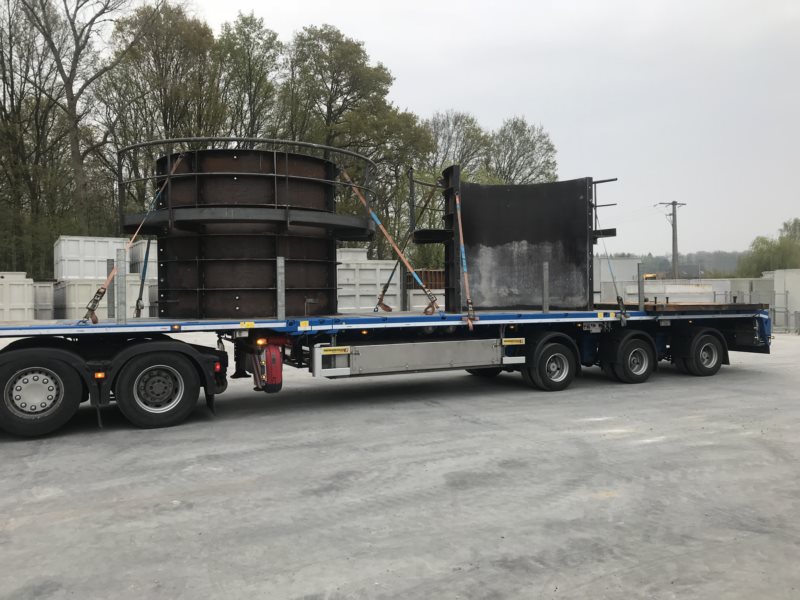 Notre plateau double extension avec essieux directionnels et télécommande permet de transporter des pièces jusque 30 mètres de longeur et 40 tonnes.
